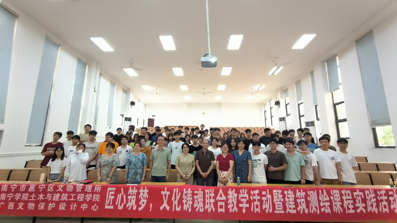6月19日,广西文物保护研究设计中心文物保护责任设计师黎程、南宁市邕宁区文物管理所所长刘炳政两位专家亲临南宁学院敷文园F104教室,为学院师生带来一场以建筑测绘、邕宁区不可移动文物为背景的专题讲座。聆听本次讲座的有土建学院建筑学教研室范媛、银晓琼、吴扬共3位教师,以及正在开展此次实训课程的2020级建筑学全体同学。