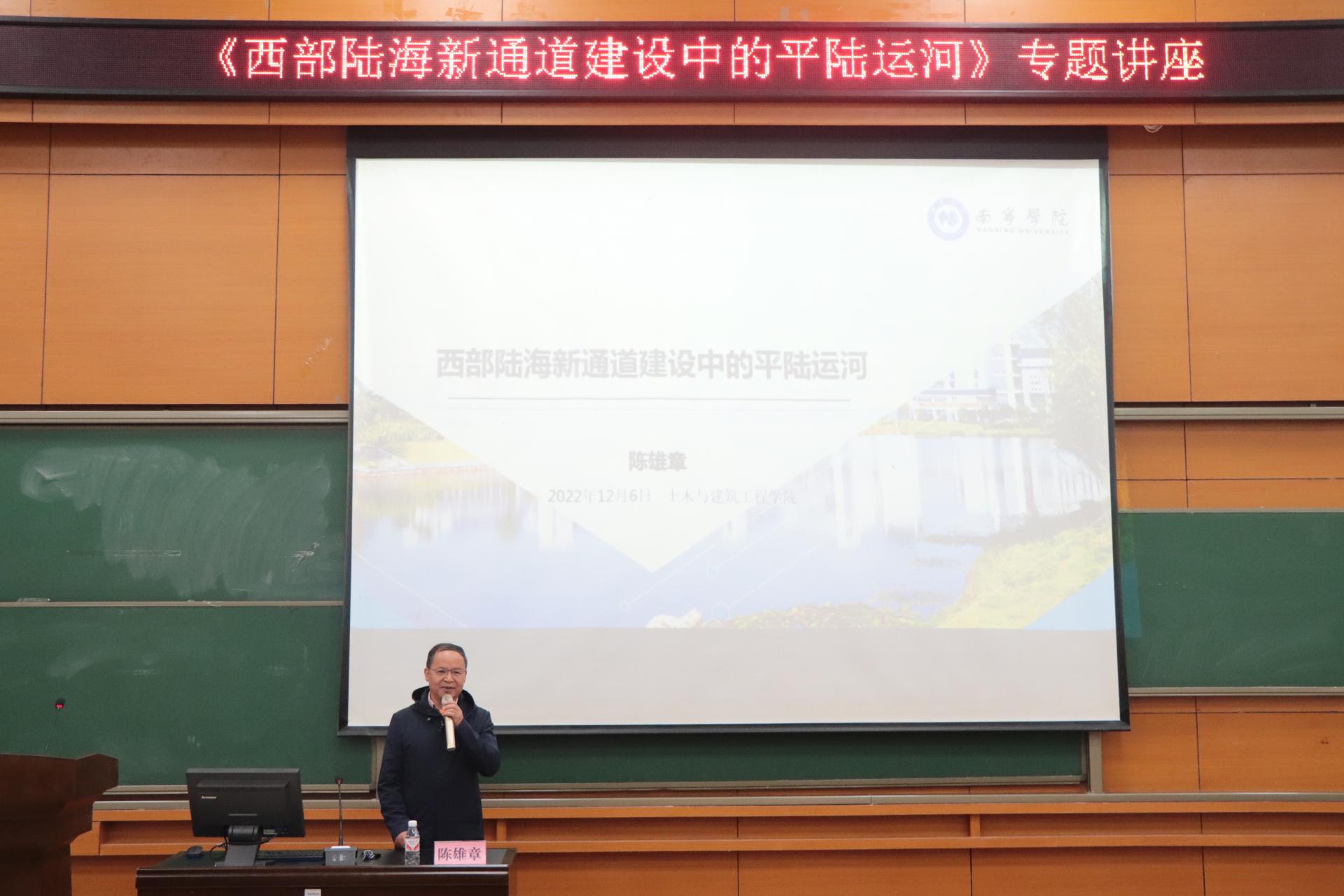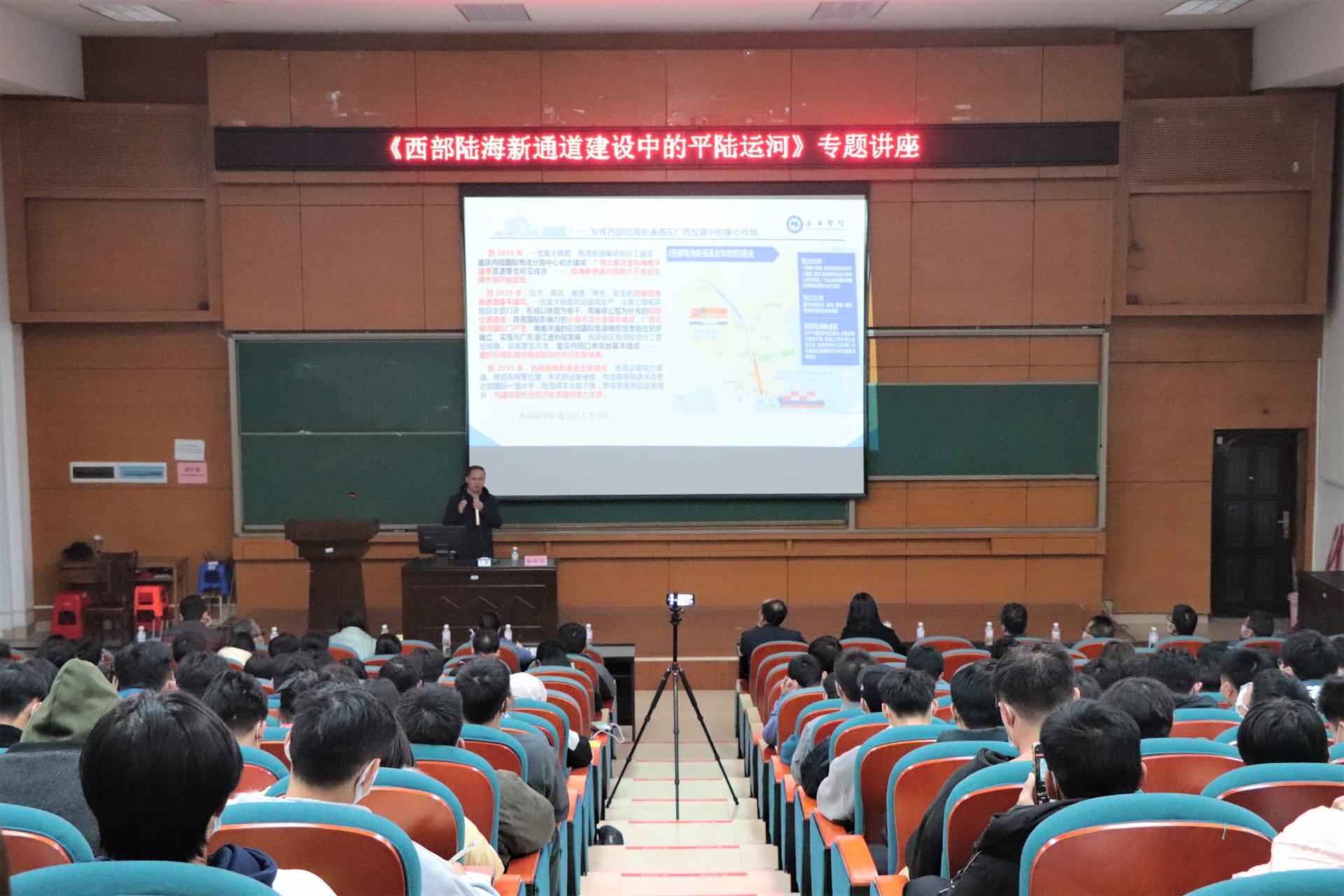 首先,沈建增院长对陈雄章副校长的到来表示衷心的感谢和热烈的欢迎,并表示此次讲座报告采用线上线下相结合的方式,让同学们了解到西部陆海通道建设中的平陆运河相关知识点,一起感受陈雄章副校长激情澎湃的讲座。讲座中,陈雄章副校长采用PPT演示和视频的方式给在场师生讲解西部陆海新通道建设中的平路运河,主要从以下四个方面进行阐述:发挥西部陆海新通道在广西发展中的牵引作用、从“钦邕盐道”到“平陆运河”、引发宇宙大爆炸的平陆运河、广西运河的未来规划蓝图。