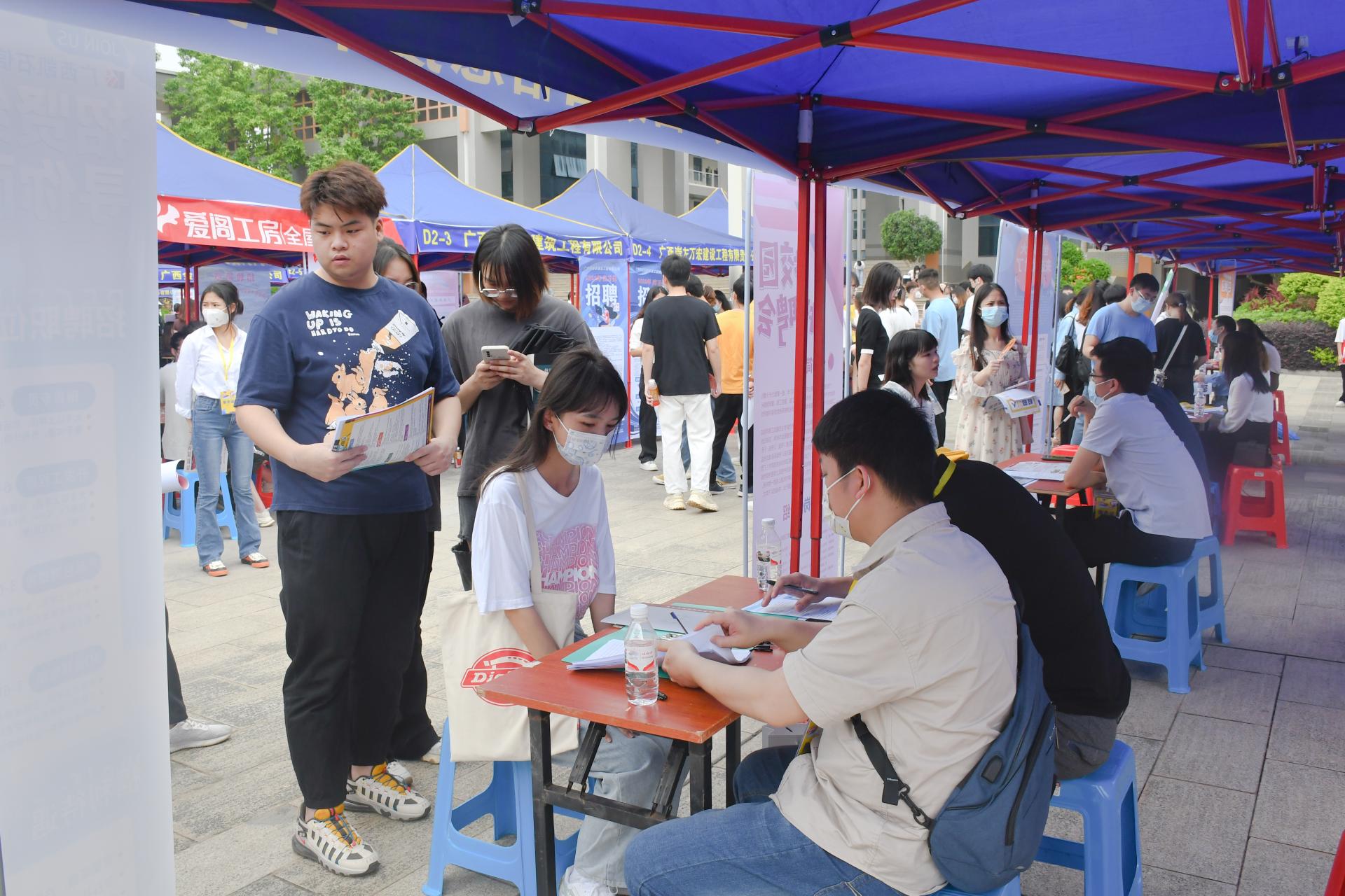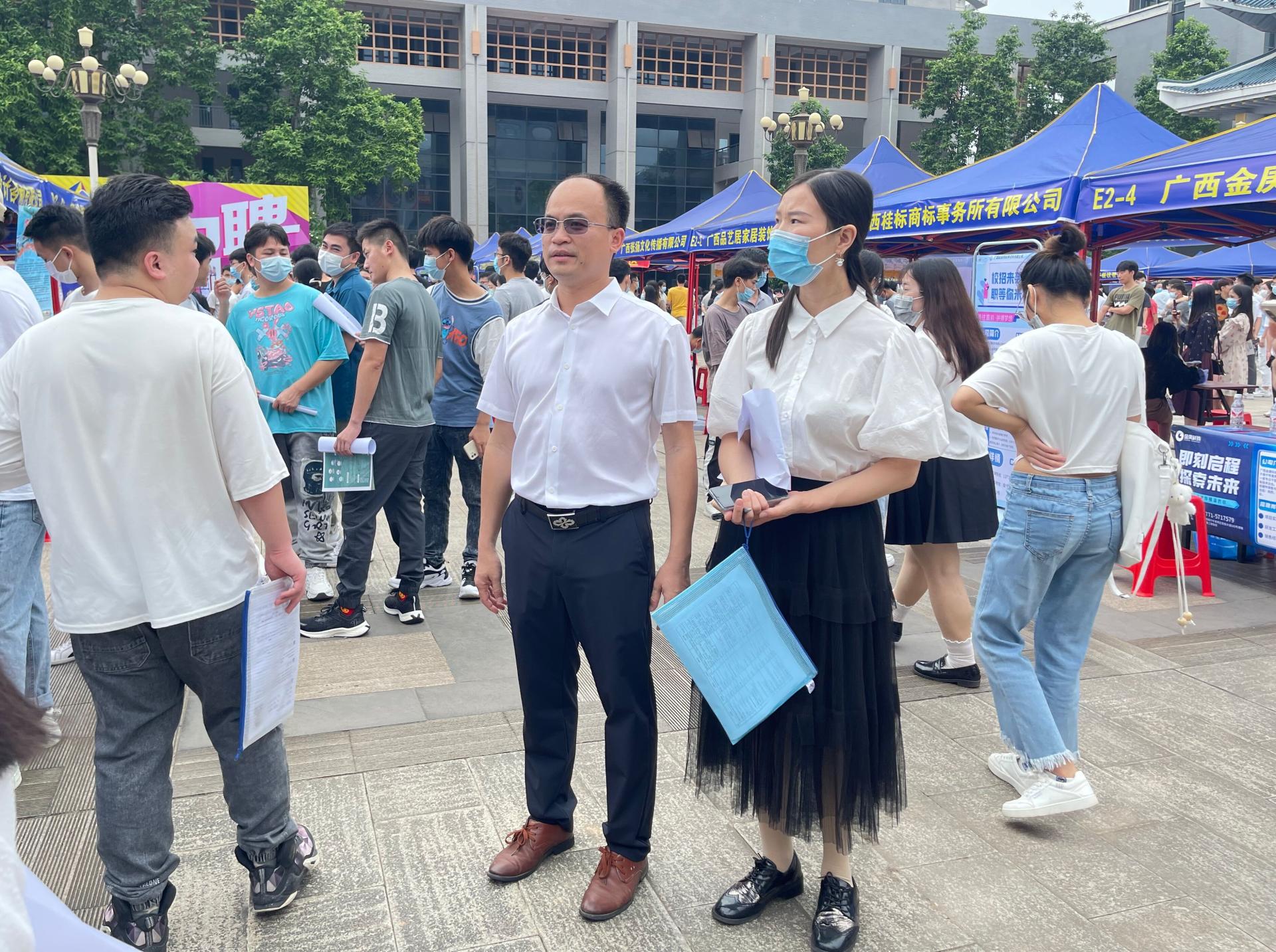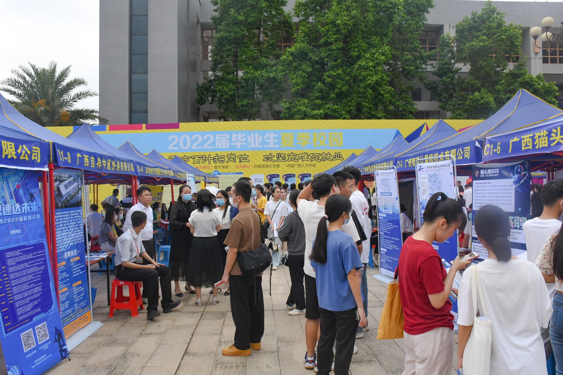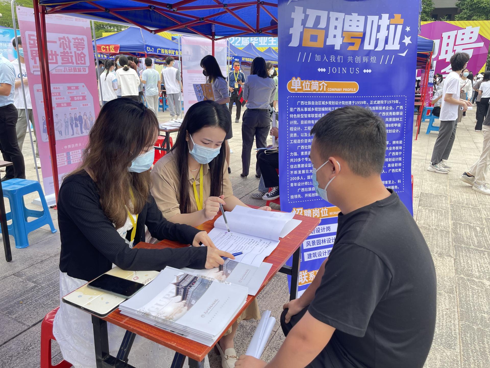 为落实我院毕业生就业专项工作部署,积极拓展毕业生就业渠道,促进毕业生更加充分更高质量就业,5月20日上午,我校在南门广场举行2022届毕业生夏季校园招聘会,吸引了中视智媒(广州)文化传媒有限公司、广西宏创云计算有限公司等152家区内外用人单位前来招聘,提供岗位数约4900个,其中与我们学院对口的企业19家,不限专业35家。包括广西城乡规划设计院、南宁交投集团、南宁工程造价咨询有限公司等对口企业。学院副院长沈建增、赵娟,各教研室教师代表,毕业班辅导员们也亲临现场,为毕业生们做现场指导与应聘辅导,共同帮助学生们积极应聘。