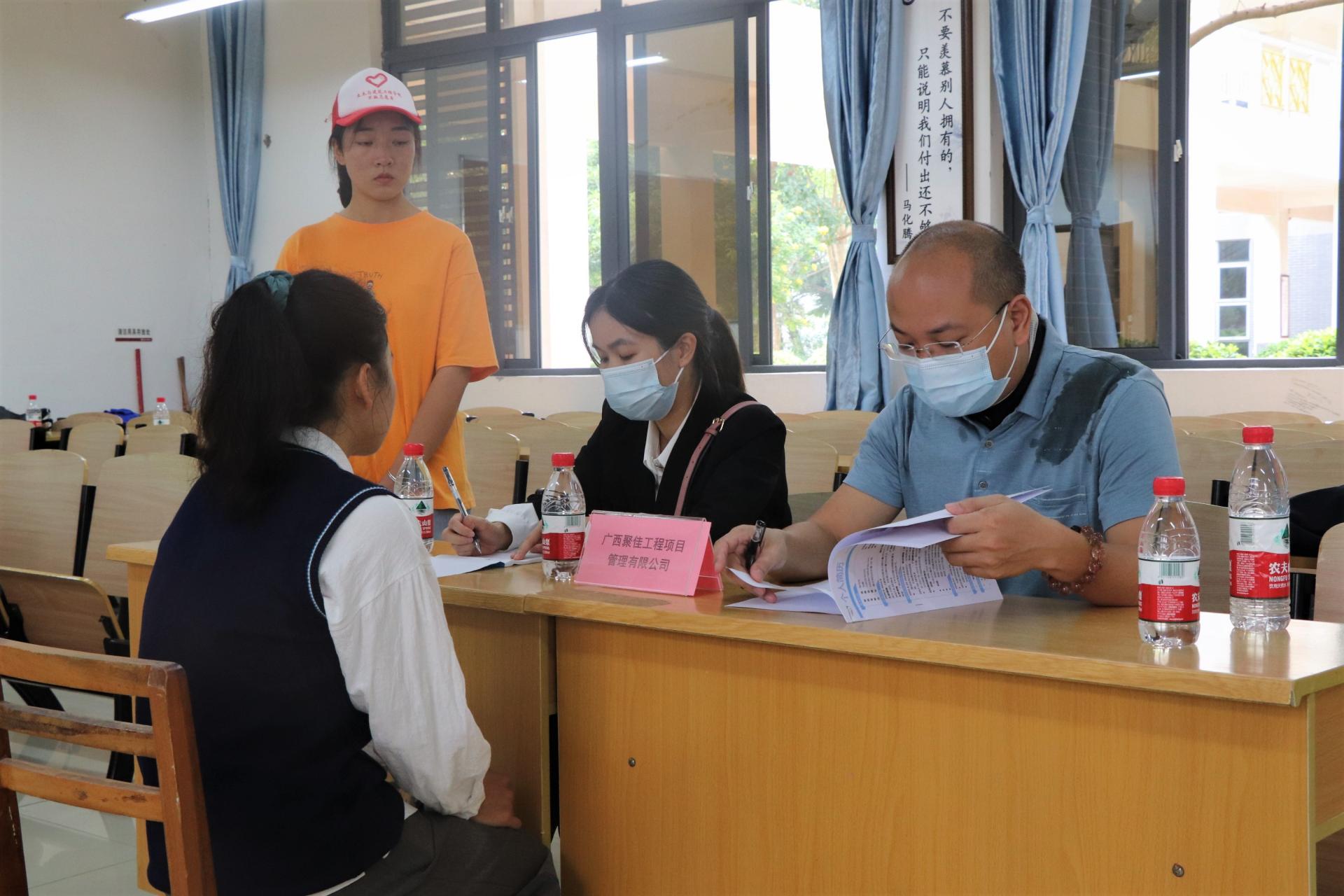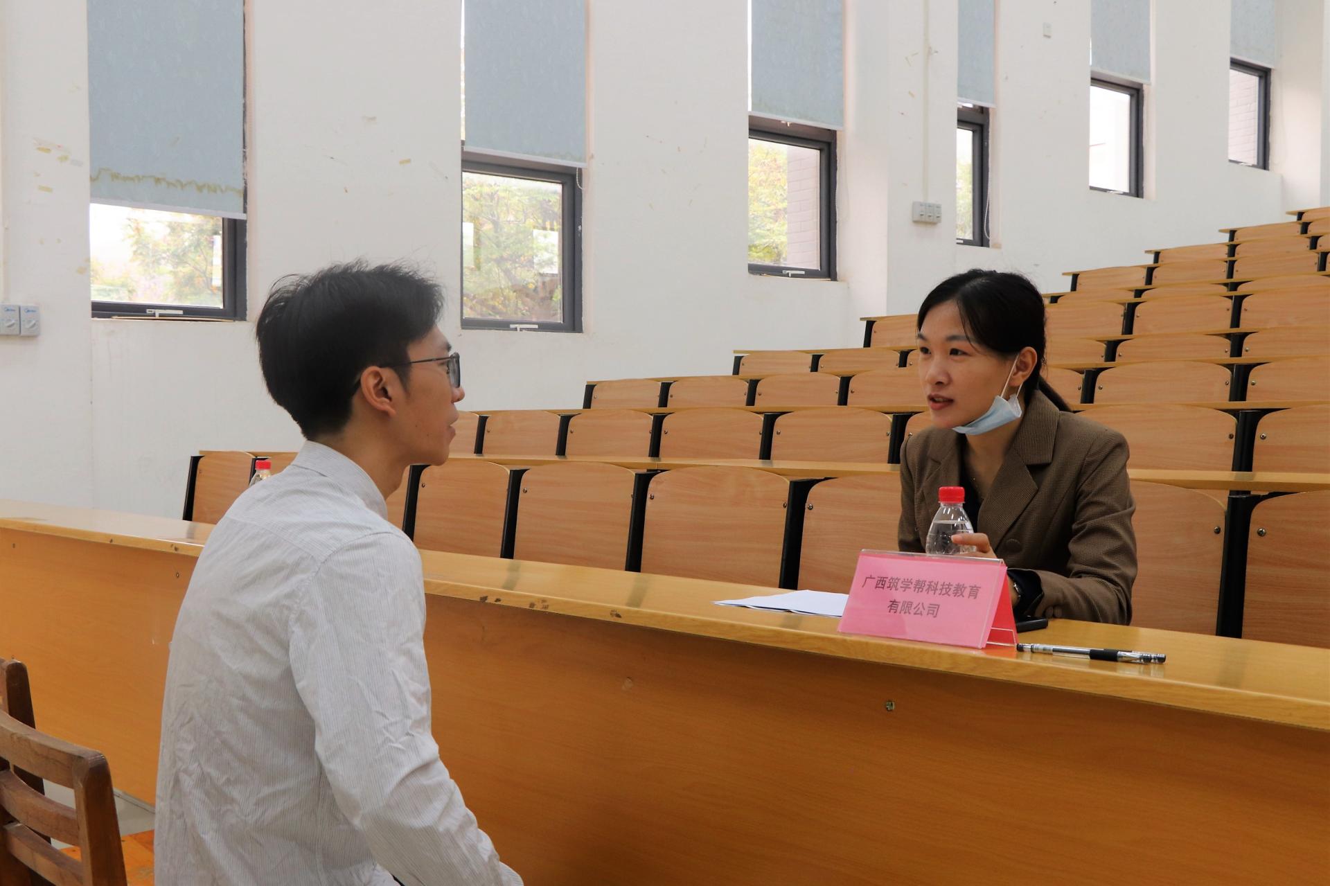 本次招聘会土木与建筑工程学院邀请了广西筑学帮科技教育有限公司、广西金朗建设工程有限公司、广西鼎益佳工程造价咨询有限公司等十多家公司前来学院选聘优秀毕业生,毕业生们在众多的企业中综合对比后确定自己心仪的企业,有序排队等待着招聘专员接过手中的简历后进行面试,每个教室门口排起了长龙。学院领导和老师对此次招聘会给予了高度重视,细心询问招聘单位的详细情况,学生也展现出了高涨的热情与自信。