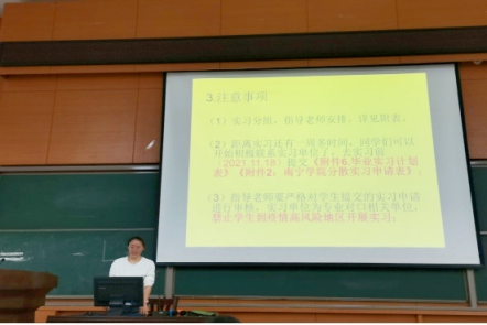 大会伊始,肖湘老师介绍大会流程,同时介绍了各毕业生指导老师,并提醒毕业生们带好实习所需材料与文件,认真做好结构、参数等记录。张鑫玉老师重点介绍了校友帮的操作流程,并要求同学们熟悉并注册好实习所用的相关程序,做好实习期间的记录工作。常萍老师强调毕业实习时要专业对口,要求毕业生先联系好实习单位并填写实习分散申请表及毕业实习计划表,注意事项实习时间,严格按照学校要求进行实习,禁止到高风险疫情区进行实习,实习期间按时打卡校友帮并按时提交周记,注意实习安全,实习结束后按时提交材料。同时希望指导老师认真负责地关注毕业生的实习情况。最后,沈建增副院长对加入指导老师团队的老师表示衷心的感谢,强调了本次毕业实习的重要性,严格要求自己并认真完成毕业设计,再次强调实习安全。