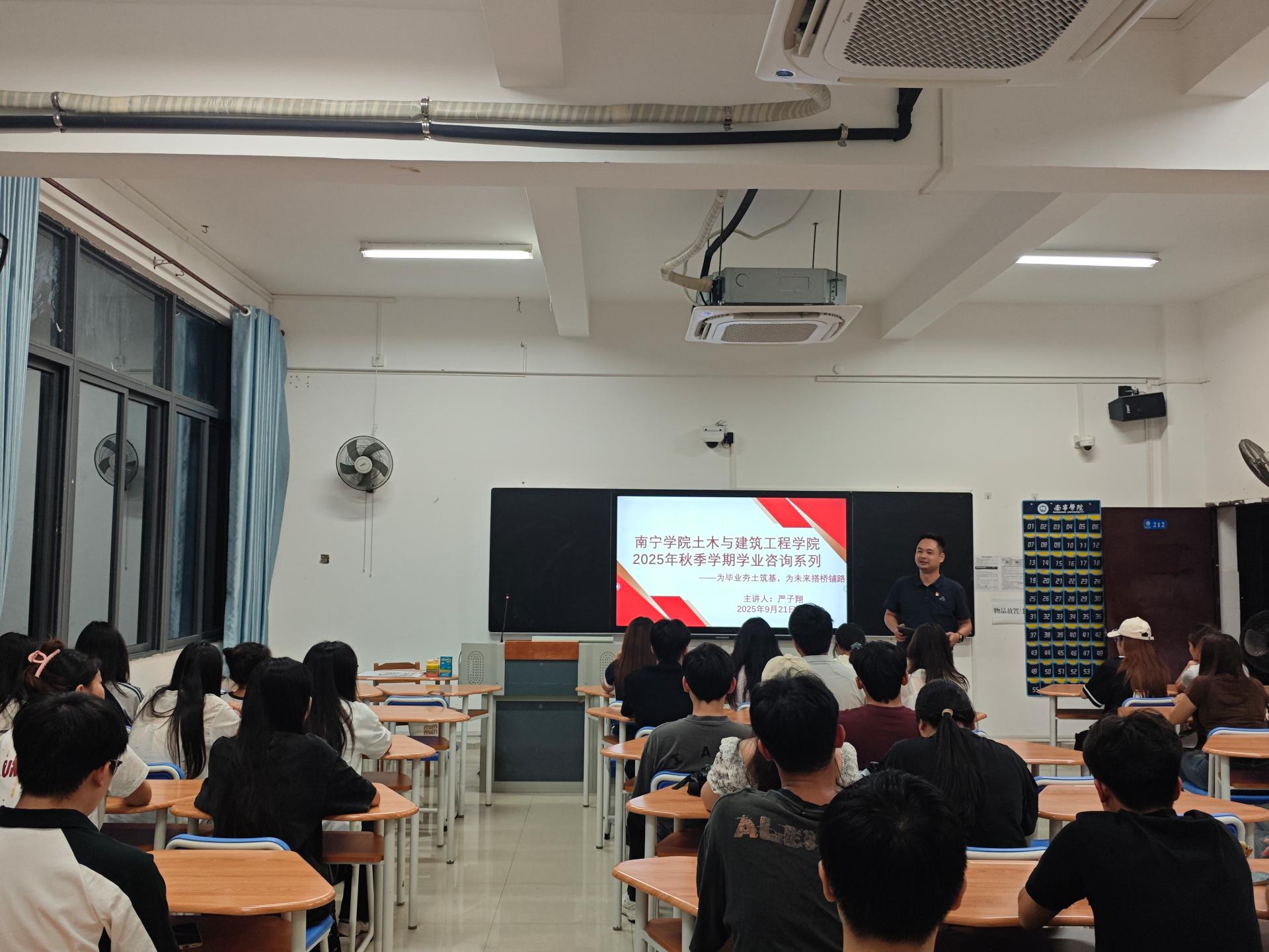 为帮助毕业班学生明确发展方向、解答学业困惑,2025年9月21日晚,南宁学院土木与建筑工程学院在敷文园F212教室举办了以“毕业夯土筑基,为未来搭桥铺路”为主题的学业咨询专场报告会。本次报告会由学院副书记严子翔主讲,围绕毕业与就业等学生关切议题展开系统讲解与深入交流。