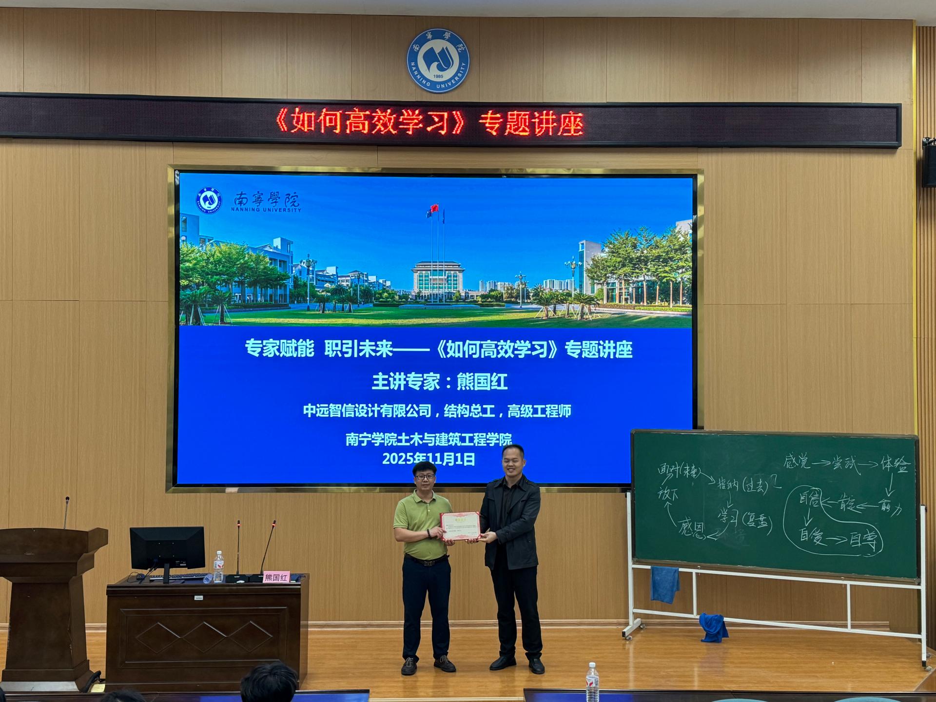 2025年11月1日,由学院主办的“筑建未来”系列专题讲座在南硅谷D104成功举行。本次讲座聚焦“如何高效学习”这一核心议题,特邀中远智信设计有限公司结构总工程师、高级工程师熊国红先生担任主讲嘉宾,为现场师生带来了一场内容丰富、启发性强的学习方法论盛宴。
