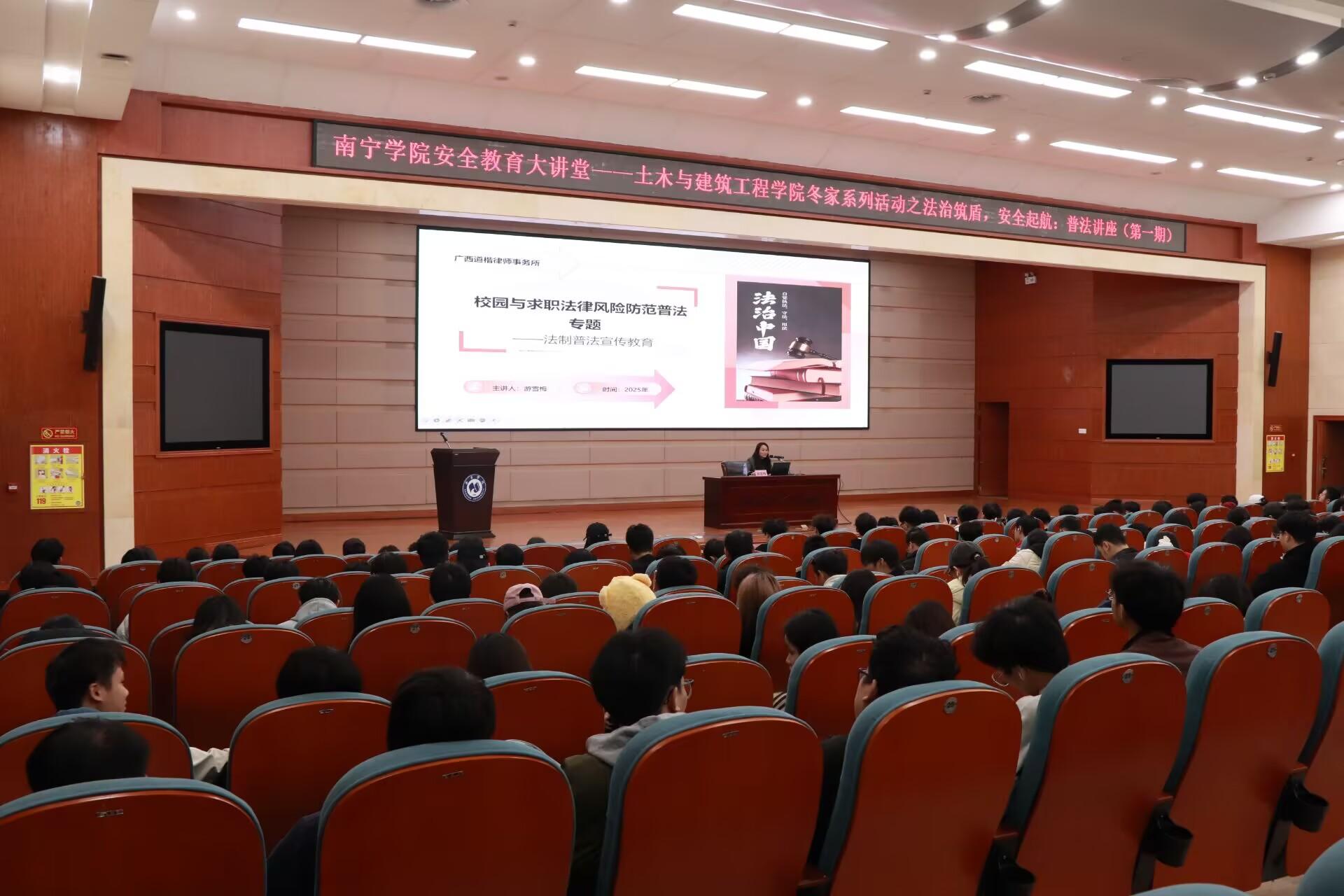 为筑牢校园法治根基,帮助同学们厘清校园、职场等场景中常见的法律盲区,做深做细学院的就业育人工作,2025年11月19-20日,土木与建筑工程学院联合广西道楷律师事务所开展法律风险防范普法专题讲座,邀请专职律师游雪梅担任主讲,围绕就业和求职等校园生活相关核心议题,通过案例解析、法条阐释和实务指引等方式,系统梳理同学们在校园生活中的法律要点,为同学们未来的职场生涯保驾护航。