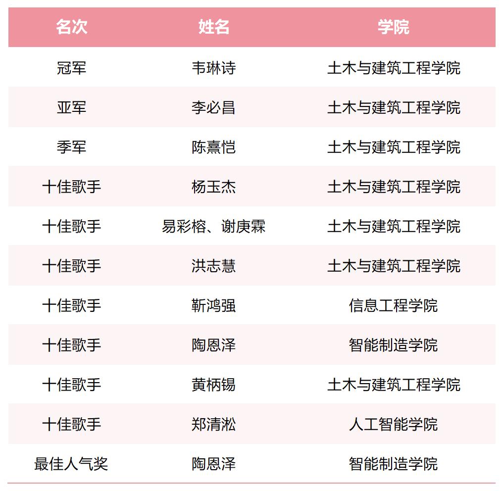 逐韵承扬青年志,循声赶赴时代约。此次校园十大歌手大赛的亮眼成绩,展现了土建学子以歌传志、向阳生长的昂扬姿态,也彰显了我院在美育育人方面取得的扎实成效。学院将以此为契机,深化“美育大课堂”品牌建设,依托“三师一员”协同赋能美育实践,以美启智、以文化人,为落实立德树人根本任务、培育兼具工程素养与人文情怀的新工科人才筑牢根基。(土木与建筑工程学院供稿 文/雷佳华、李嘉欣 图/团委宣传部 一审一校/李嘉欣 二审二校/雷佳华 三审三校/严子翔)