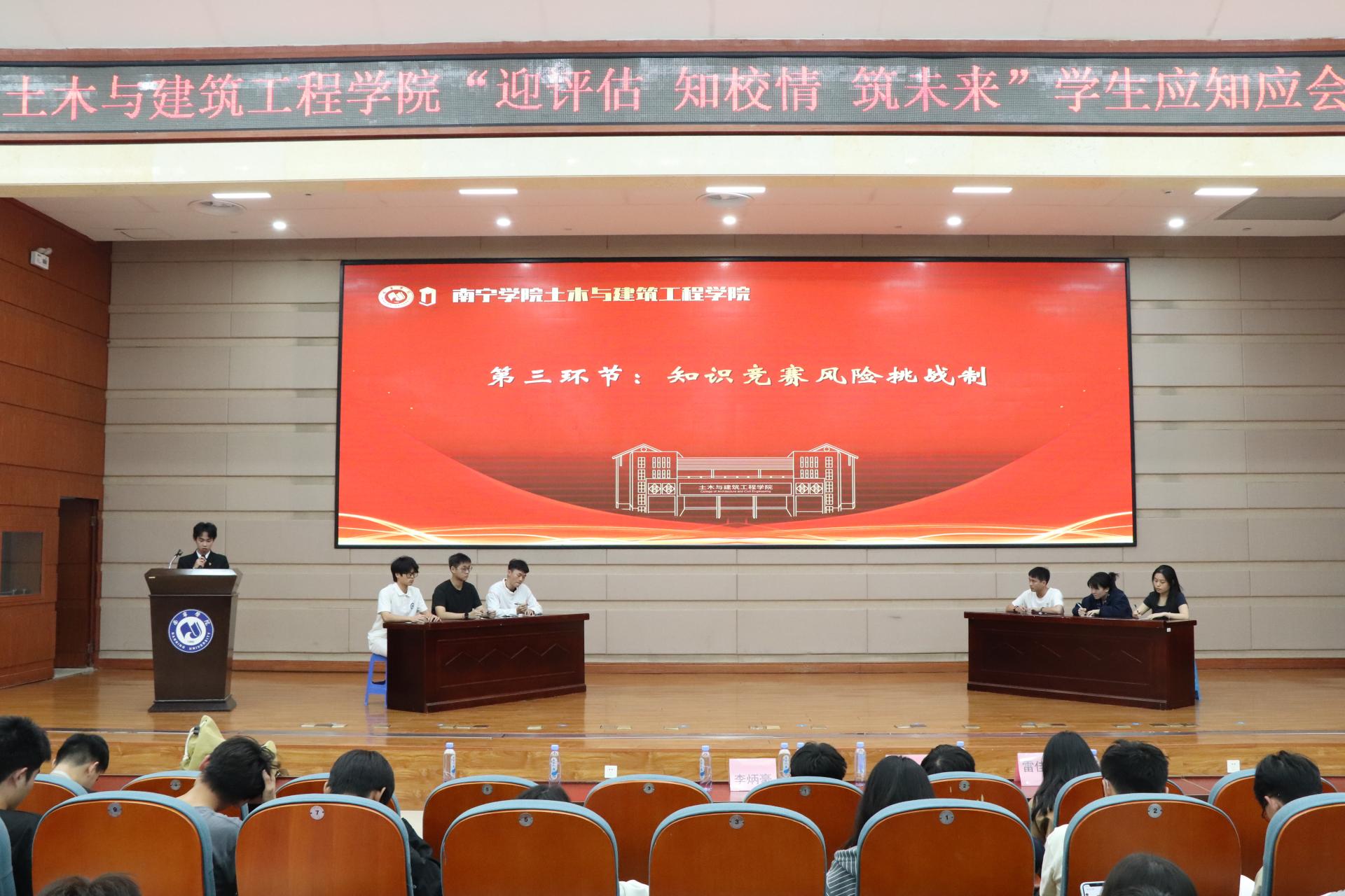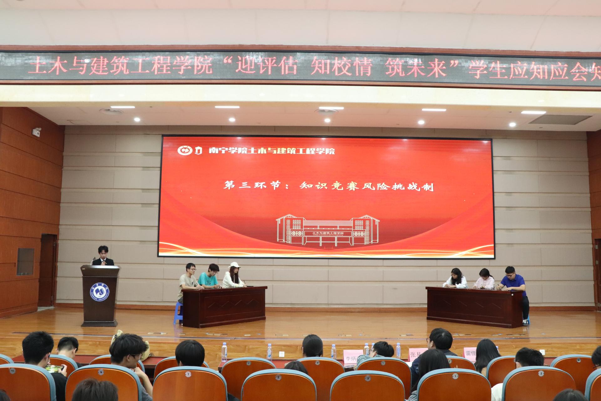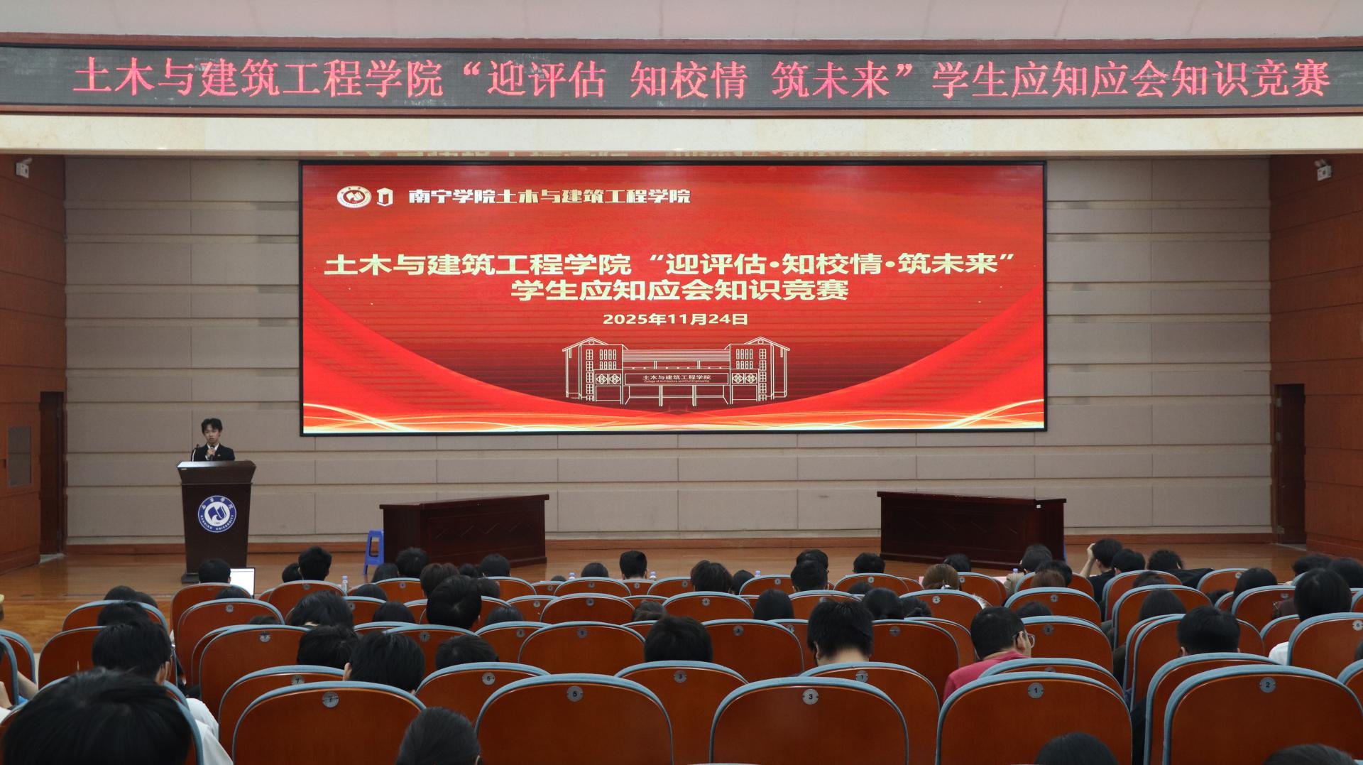 为扎实推进学校本科教育教学审核评估工作,营造全员参与、共同备战的良好氛围,11月24日晚,南宁学院土木与建筑工程学院“迎评估·知校情·筑未来”学生应知应会知识竞赛决赛在图书馆报告厅顺利举行。学院党委副书记严子翔、学生科全体辅导员出席活动,各基层班级组队参赛,数百名学生到场观赛。