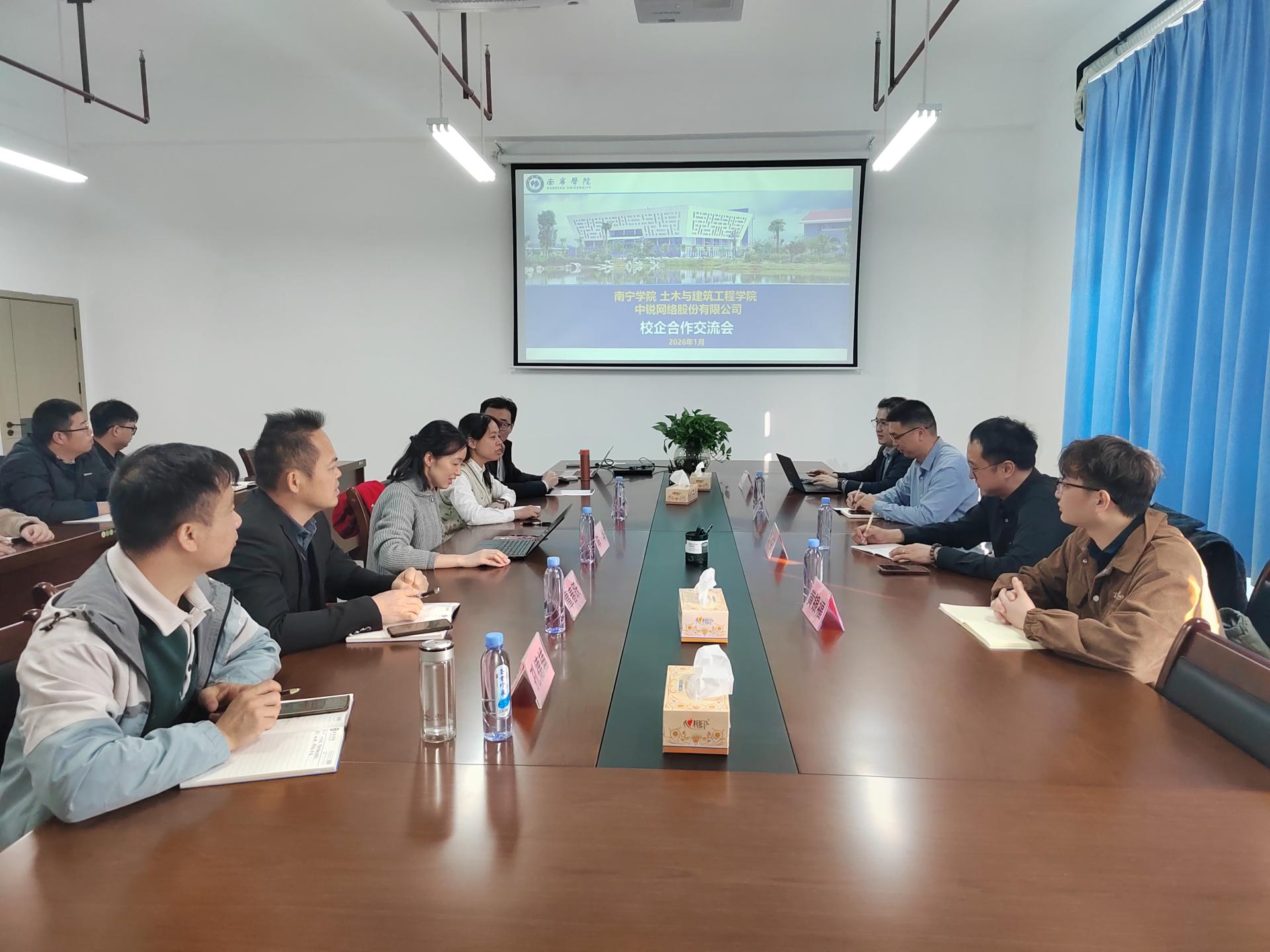 为主动应对建筑行业智能化转型趋势,深化产教融合,推动课程体系优化与教学资源共建,2026年1月14日,土木与建筑工程学院与中锐网络股份有限公司在东盟楼A1007举行校企交流研讨会。会议由智能建造教研室主任张雯主持,学院副院长陈华教授、各专业教师代表,中锐公司产品总监黄喆及技术团队、华为工程师黄子豪等共同参会。