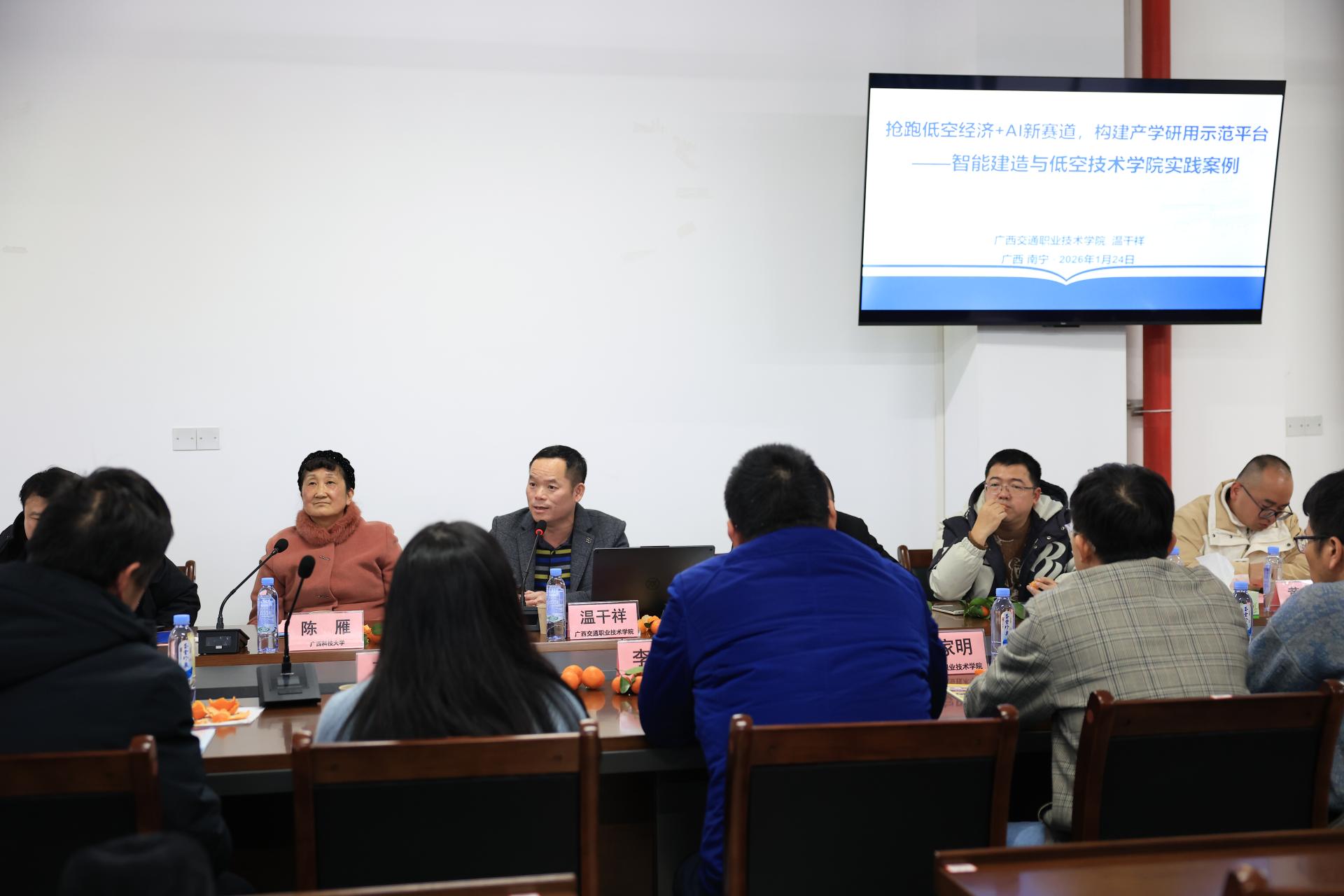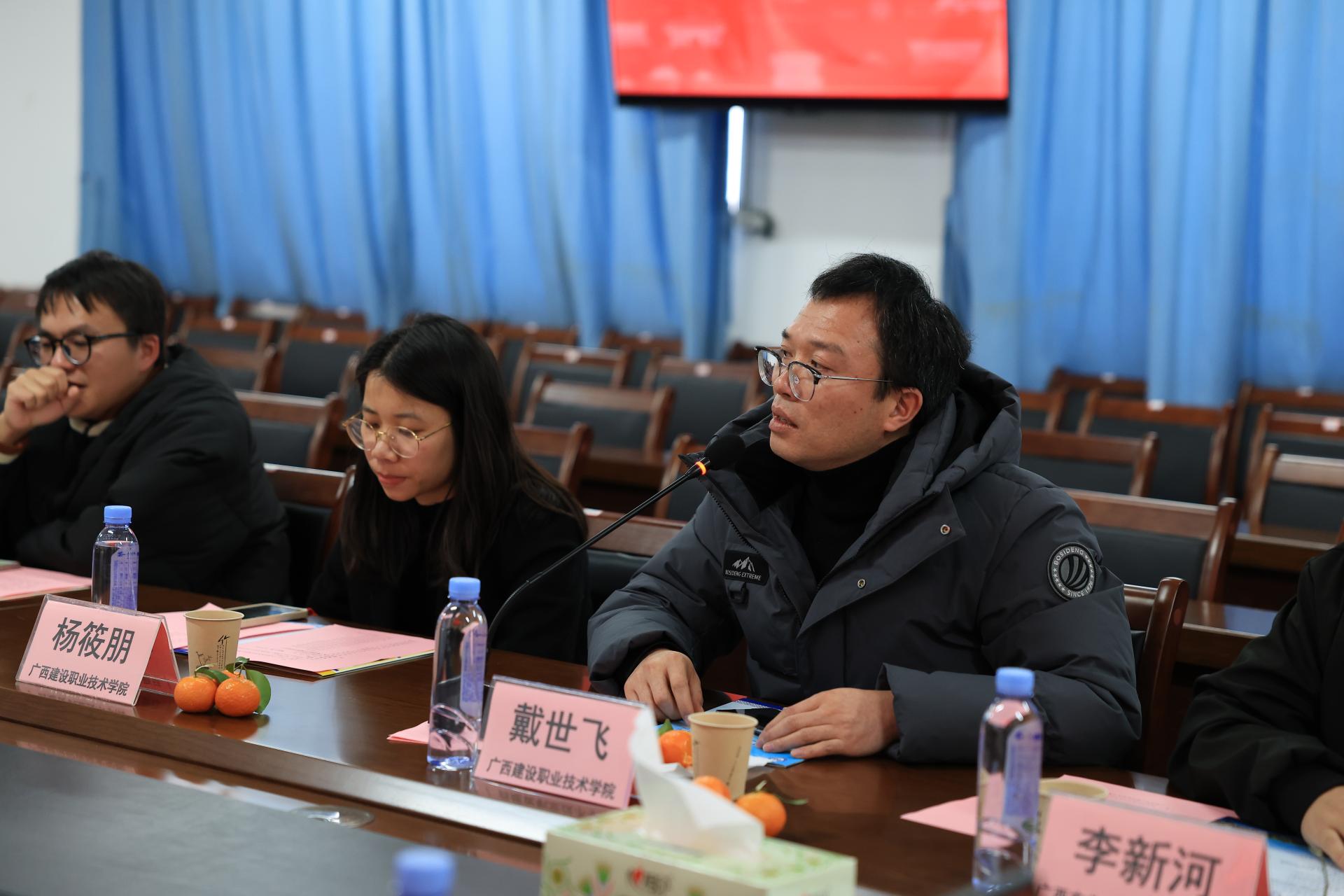 在专业建设与特色发展方面,各高校分享了具体实践。广西建设职业技术学院代表黄锦帅围绕专业内涵提升,分享了该校在专业设置与课程体系改革上的经验;广西交通职业技术学院学工处副处长温干祥老师则介绍了智能建造与低空技术学院的实践案例,重点阐述了项目的人才培养、技能培训与场景应用实践模式,强调要依靠技术产生相应的培养效能。最后,广西科技大学土木建筑工程学院邓宇院长分享了广西科技大学博士点建设工作的进展与经验,为学科发展与人才培养提供了借鉴。