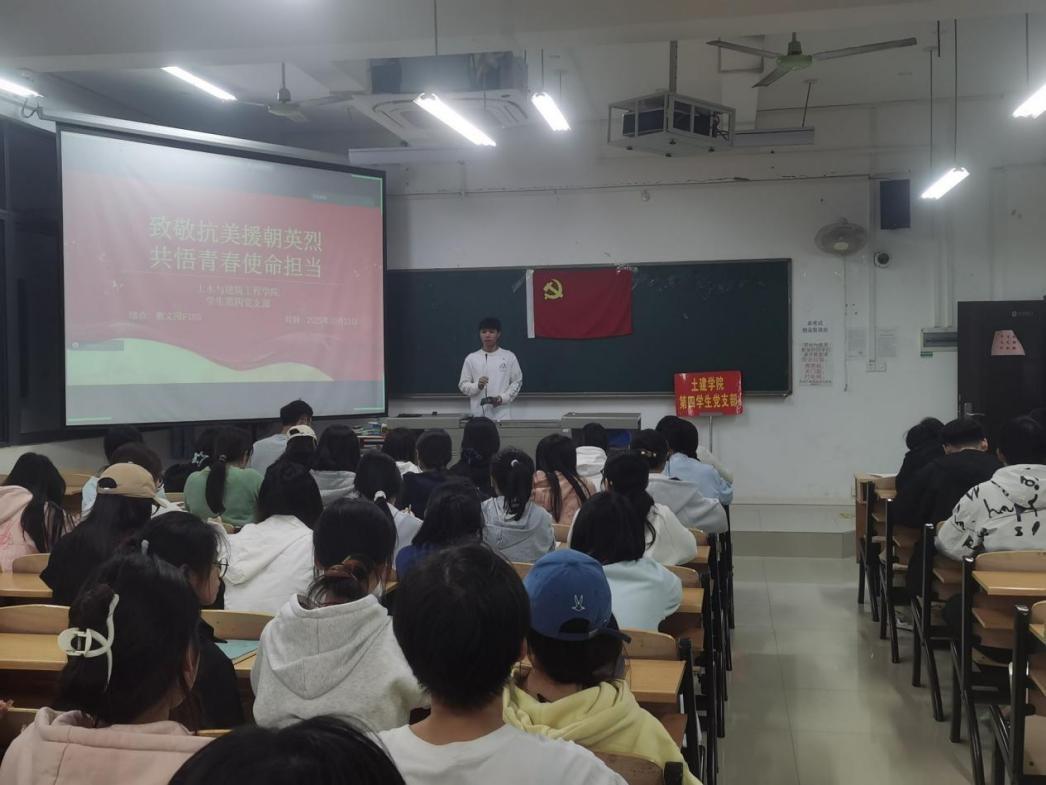 为缅怀抗美援朝英烈,传承伟大抗美援朝精神,引导支部党员深刻感悟青春使命与时代担当,10月23日,土木与建筑工程学院学生第四党支部在敷文园F105教室开展“致敬抗美援朝英烈,共悟青春使命担当”主题党日活动。支部全体成员参加此次活动。