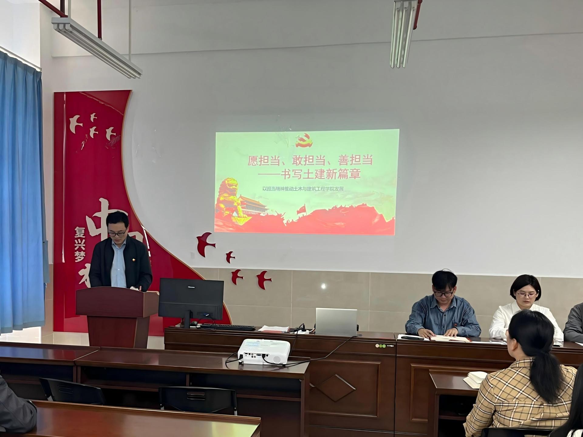 会上,全体党员首先开展第一议题学习。随后杨波同志以“愿担当、敢担当、善担当,书写土建新篇章”为题领学,引导党员筑牢初心本色、锤炼担当勇气、提升担当本领,推动学院高质量发展。