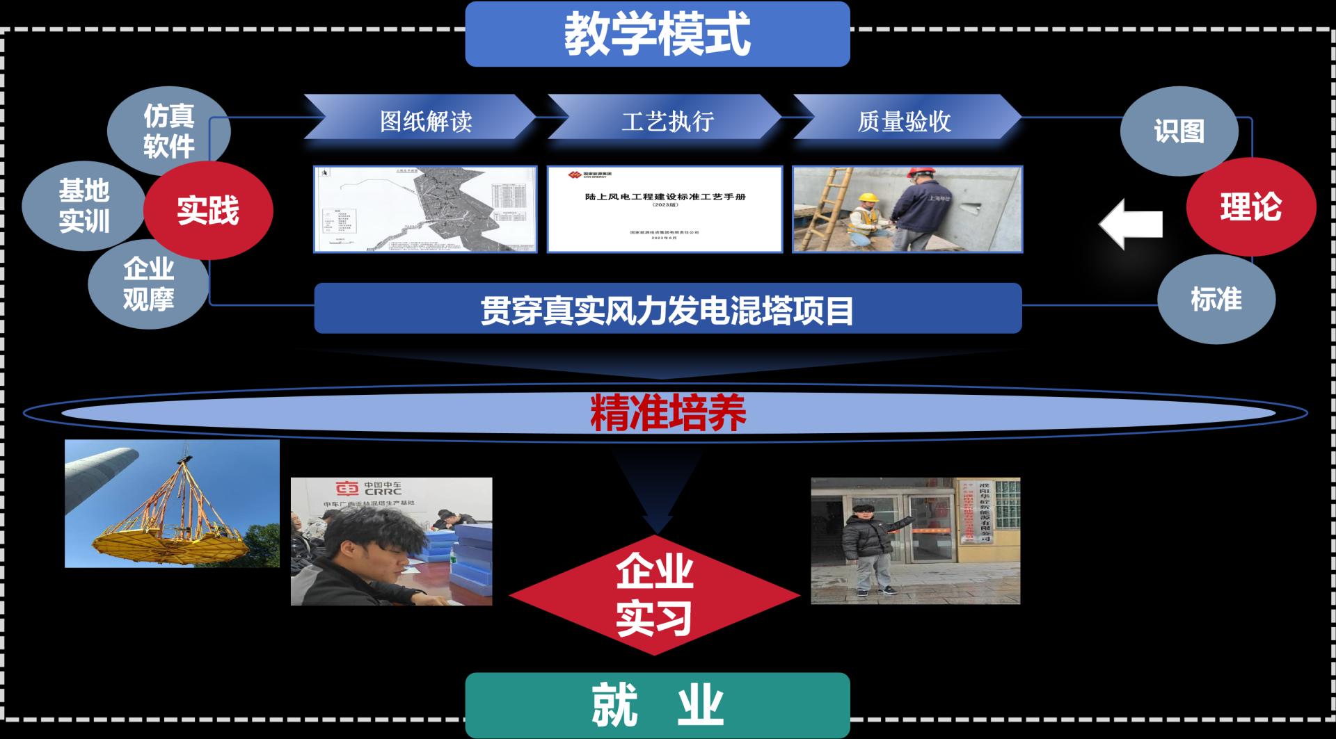 《风力发电混塔技术》微专业的教学模式可以概括为:项目贯穿、理实嵌套、订单衔接。