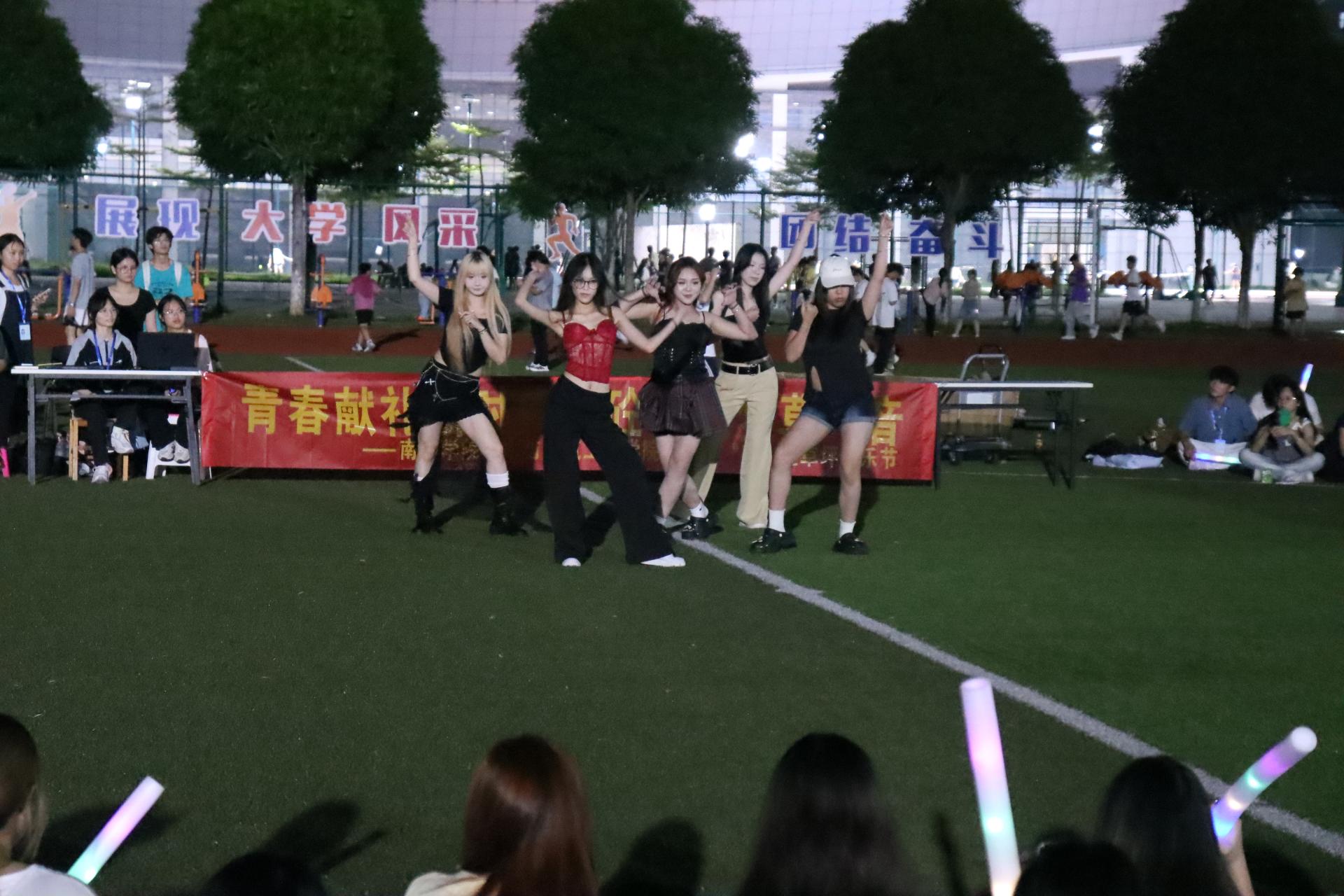 下半场演出同样精彩绝伦。学院学生会文艺部艺术团舞蹈队带来的《moevv》舞姿利落矫健,队员们随着动感旋律灵活变换队形,肢体的舒展与节奏的契合恰到好处,既展现了青春舞动的活力,又彰显了艺术表演的张力,酷飒气场直击人心;黄柄锡演唱的《想你的夜》深情款款,温柔嗓音中满含思念之情,细腻的情感表达戳中现场观众心扉;米洪民的《小丑女》则风格迥异,慵懒魅惑的唱腔搭配随性洒脱的舞台动作,将歌曲的独特韵味诠释得淋漓尽致,传递出青春的多元风貌;黄柄锡和林笑语唱的《屋顶》,旋律浪漫治愈,和声清澈灵动,满溢青春温情与美好。最后,学生礼仪队的优雅走秀惊艳全场,队员们身着精致服饰,步履从容稳健,将礼仪之美与青春风采完美融合,将音乐节的氛围推向顶峰,为这场历时两小时的美育盛宴画上圆满句号。