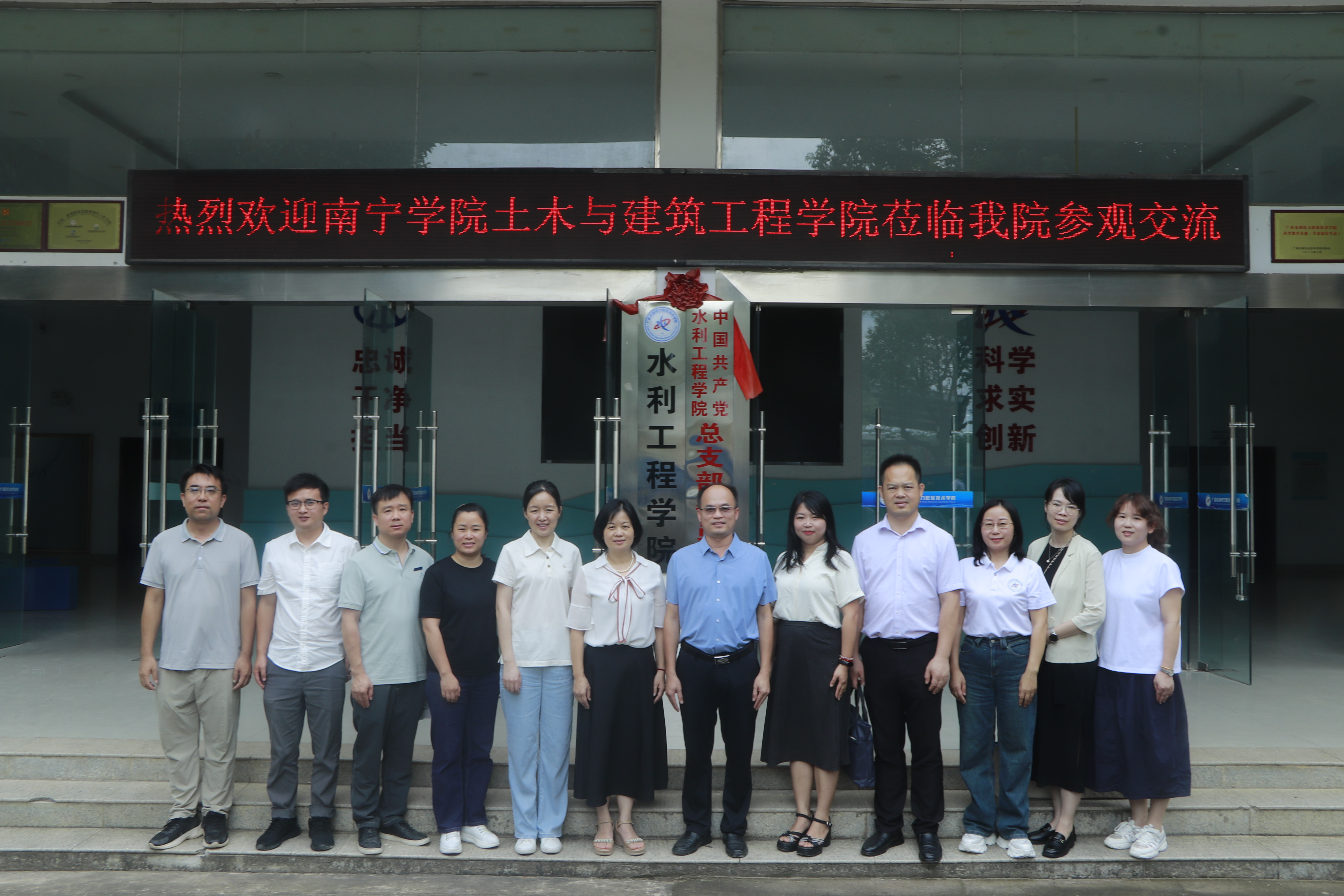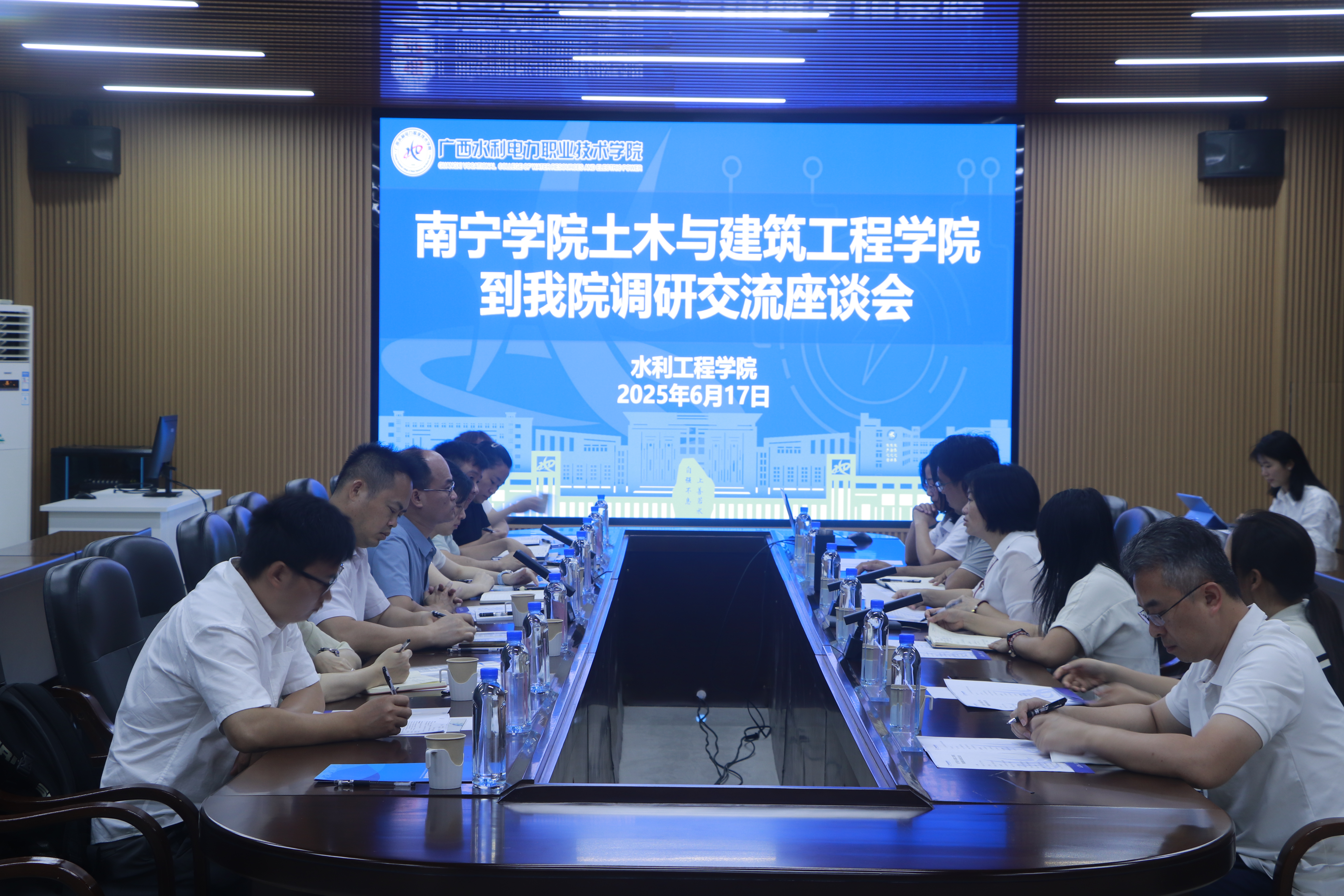 2025年6月17日,南宁学院土木与建筑工程学院执行院长沈建增率队赴广西水利电力职业技术学院水利工程学院,开展以“交流学习、共促发展”为主题的校际交流活动。双方围绕专业建设、人才培养、院校合作等议题展开研讨,并实地考察实训基地,共探行业人才培养创新路径。