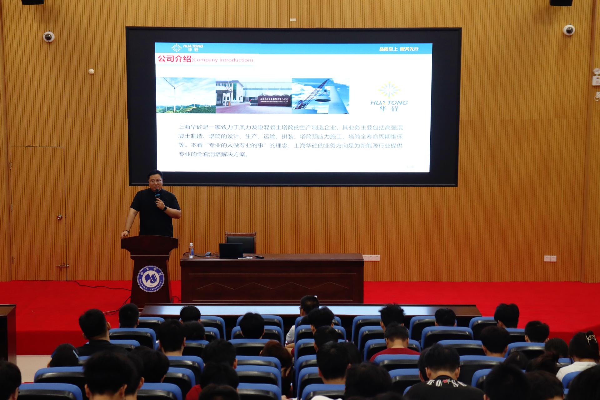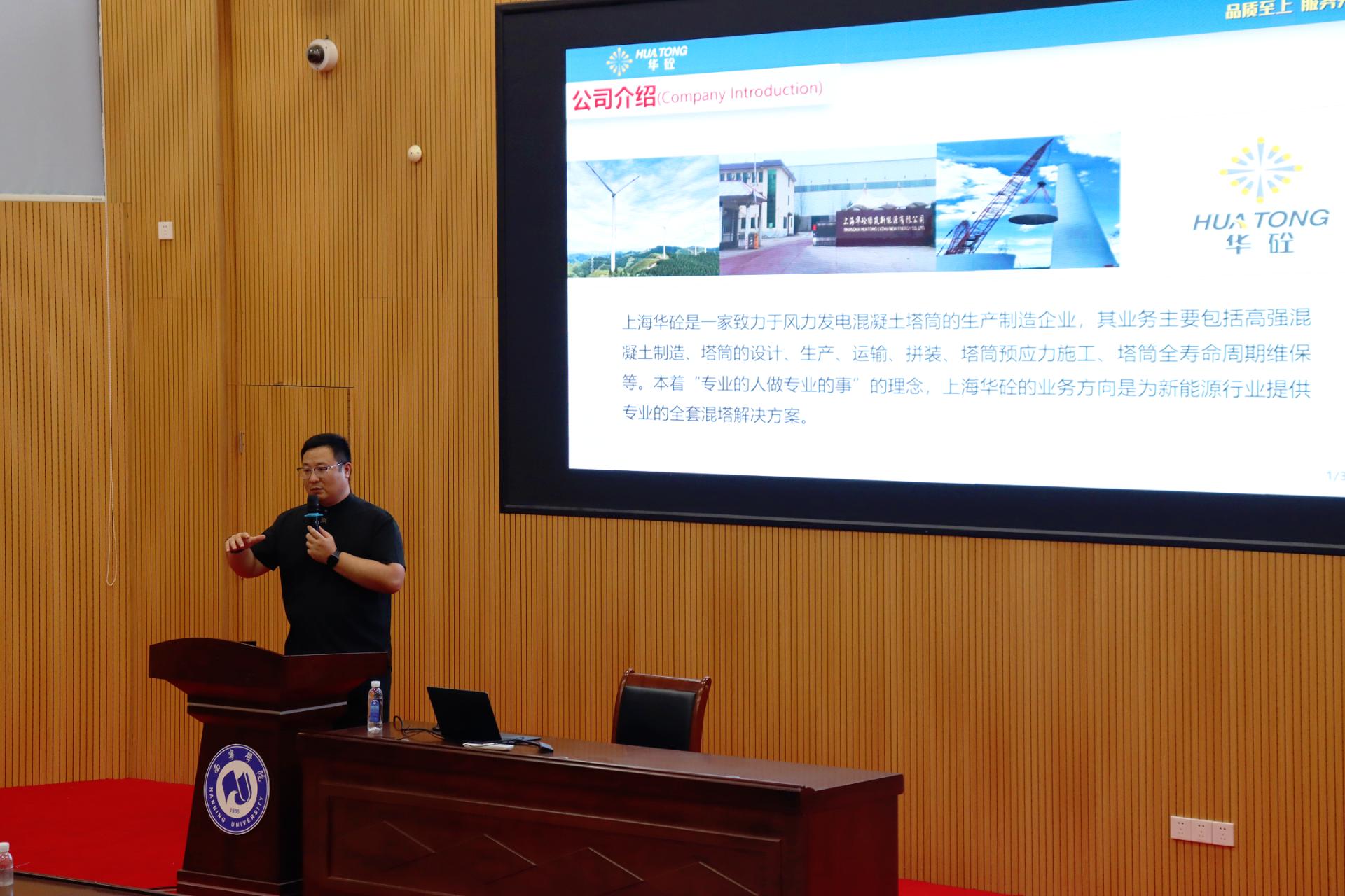 广西华砼新能源有限公司作为上海华砼绿筑新能源有限公司在西南地区的重要战略布局,专注新能源技术研发与混塔智造产业应用,公司不仅是玉林首个混塔智造项目的承建方,更填补了玉林市绿色基建领域的空白。值得关注的是,广西华砼新能源有限公司已连续第三年来我院开展招聘工作,充分体现了校企双方深厚的人才培养互信基础。宣讲会上,胡超总经理围绕风电混塔行业发展前沿、公司核心业务及未来人才战略进行了系统讲解,结合真实项目案例,为同学们带来了一线实践的生动分享。